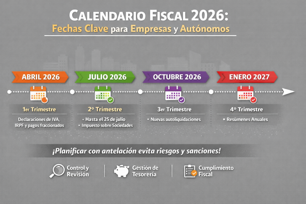 Durante 2026 se mantiene el esquema habitual de autoliquidaciones trimestrales para empresas y autónomos. Conviene tener muy claros los meses críticos:
